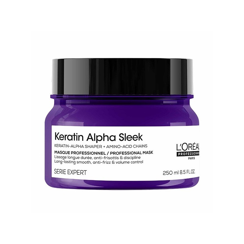 La L'Oréal Professionnel Expert Keratin Alpha Sleek Mascarilla es una mascarilla capilar profesional diseñada para suavizar el cabello, controlar el frizz y reducir el volumen. Su fórmula con Keratin Alpha y aminoácidos nutre profundamente la fibra capilar, aportando brillo y suavidad duradera. Disponible en formatos de 250 ml y 500 ml.
