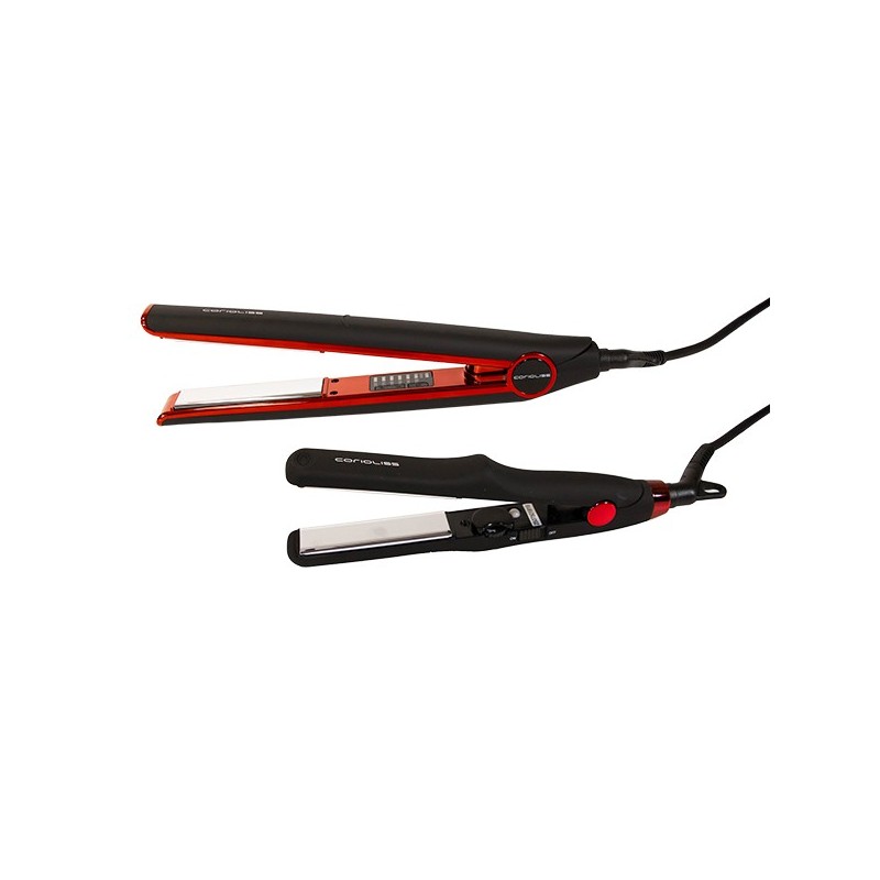 El Set Corioliss Black Red combina el poder profesional de la plancha C1 con la versatilidad de la mini plancha C-Trip. Esta edición limitada está pensada para quienes buscan un rendimiento excepcional y un diseño exclusivo, ideal tanto para el salón como para el uso personal o en viajes. Su elegante acabado en negro y rojo con textura Soft Touch ofrece un agarre cómodo y un deslizamiento perfecto para todo tipo de peinados.